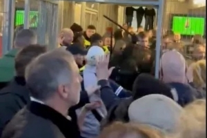 维拉资讯账号发布在社交媒体上的现场视频显示,今天凌晨,当地执法人员似乎正在向一群随队出征的球迷挥动警棍。可以听到一名维拉球迷高喊“不”,另一名球迷则试图阻止冲突进一步升级,说着“你会被逮起来的”。