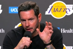 记者:“嘿,JJ。哦,抱歉,你先说吧。显然,勒布朗的角色最近发生了很大变化。当你谈到展现斗志时,看到像勒布朗这样41岁的老将依然在场上拼尽全力,其他人自然也不敢松懈。你刚才提到你们开了个会,他当时在会上给大家传达了什么信息?”