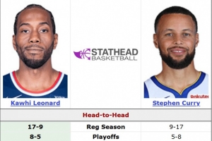 据统计,伦纳德常规赛对阵库里17胜9负,季后赛8胜5负。