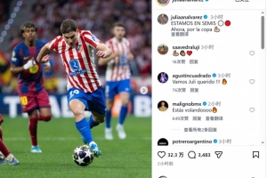 阿尔瓦雷斯社媒晒出比赛照片,庆祝球队晋级,配文:“我们晋级欧冠半决赛,现在要冲击国王杯冠军!”